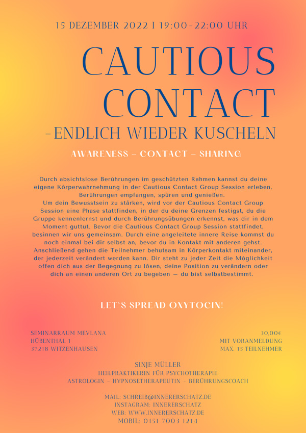 Im Cautious Contact geht es darum, vom Denken ins Fühlen zu kommen, sich selbst zu erfahren und wach für seine eigenen Bedürfnisse zu werden. Durch das Ausleben unseres ganzen Spektrums an Sinnlichkeit im Cautious Contact eröffnet sich eine Welt, in der Berührung natürlich und absichtslos empfunden werden kann. Körperkontakt ist ein menschliches Grundbedürfnis. Achtsame Berührung ist notwendig für ein gesundes Immunsystem, mentale und geistige Gesundheit sowie die Entwicklung unseres Gehirns und Nervensystems.