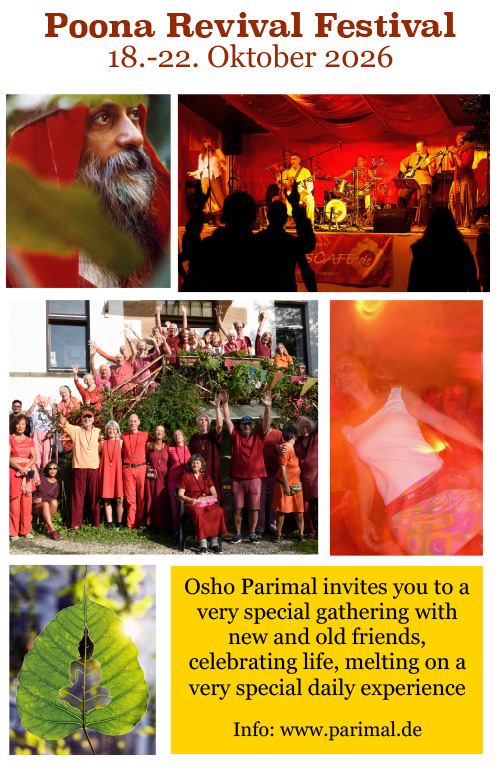 wir laden euch herzlich ein zum Poona Revival Festival im Osho Parimal – vier Tage voller Musik, Tanz, Begegnung und unvergesslichen Momenten, in denen wir den Poona-Osho-Spirit wieder aufleben lassen.